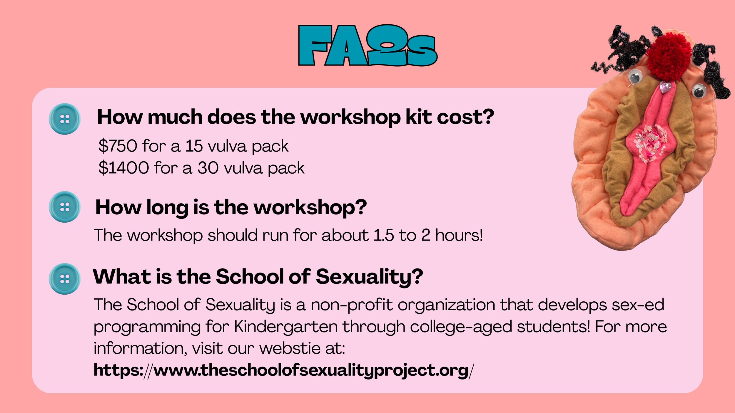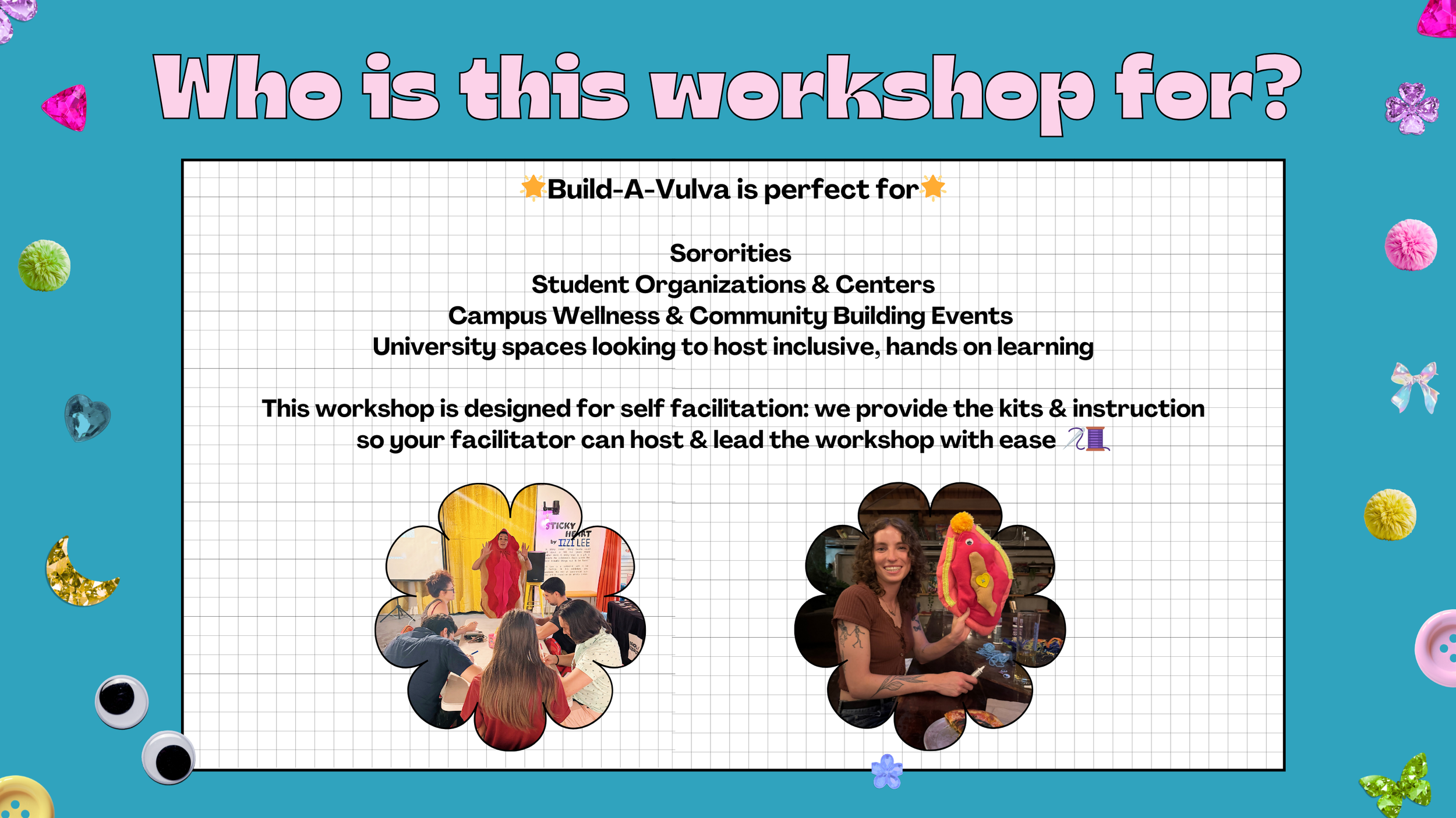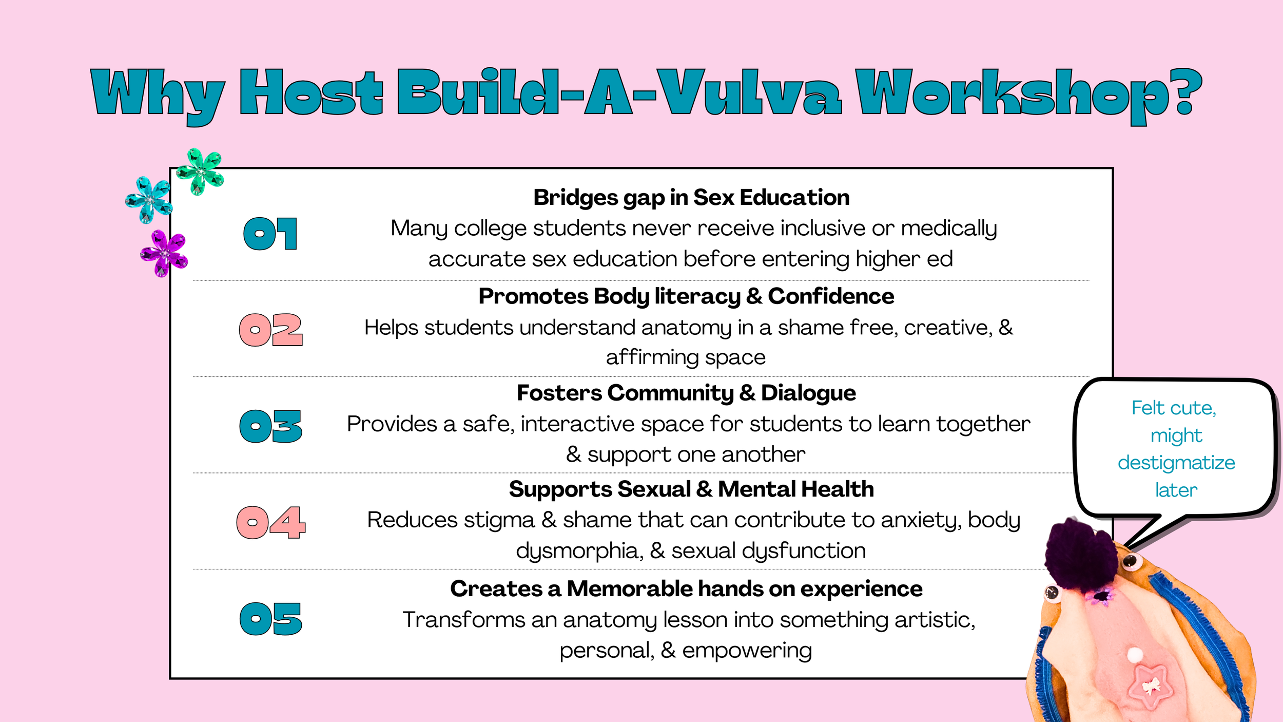 The Vulva Project reclaims conversations about bodies through art and restorative justice. Our signature Build-a-Vulva workshop invites participants—women, queer, trans, and nonbinary folx—to craft a plush model of external genitalia. By centering creativity, accurate anatomy, and shared storytelling, we dismantle shame and spark body positivity.
